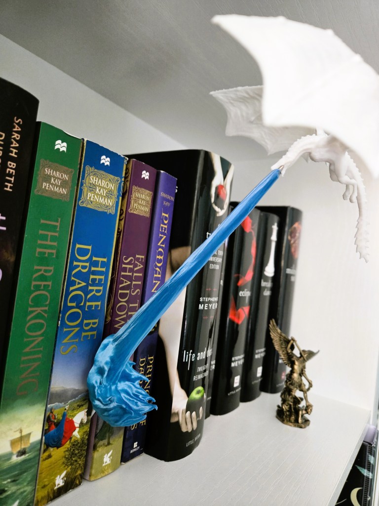 One of my beta readers gave me this dragon book stand that gives the illusion of the dragon shooting blue flames into my books.
